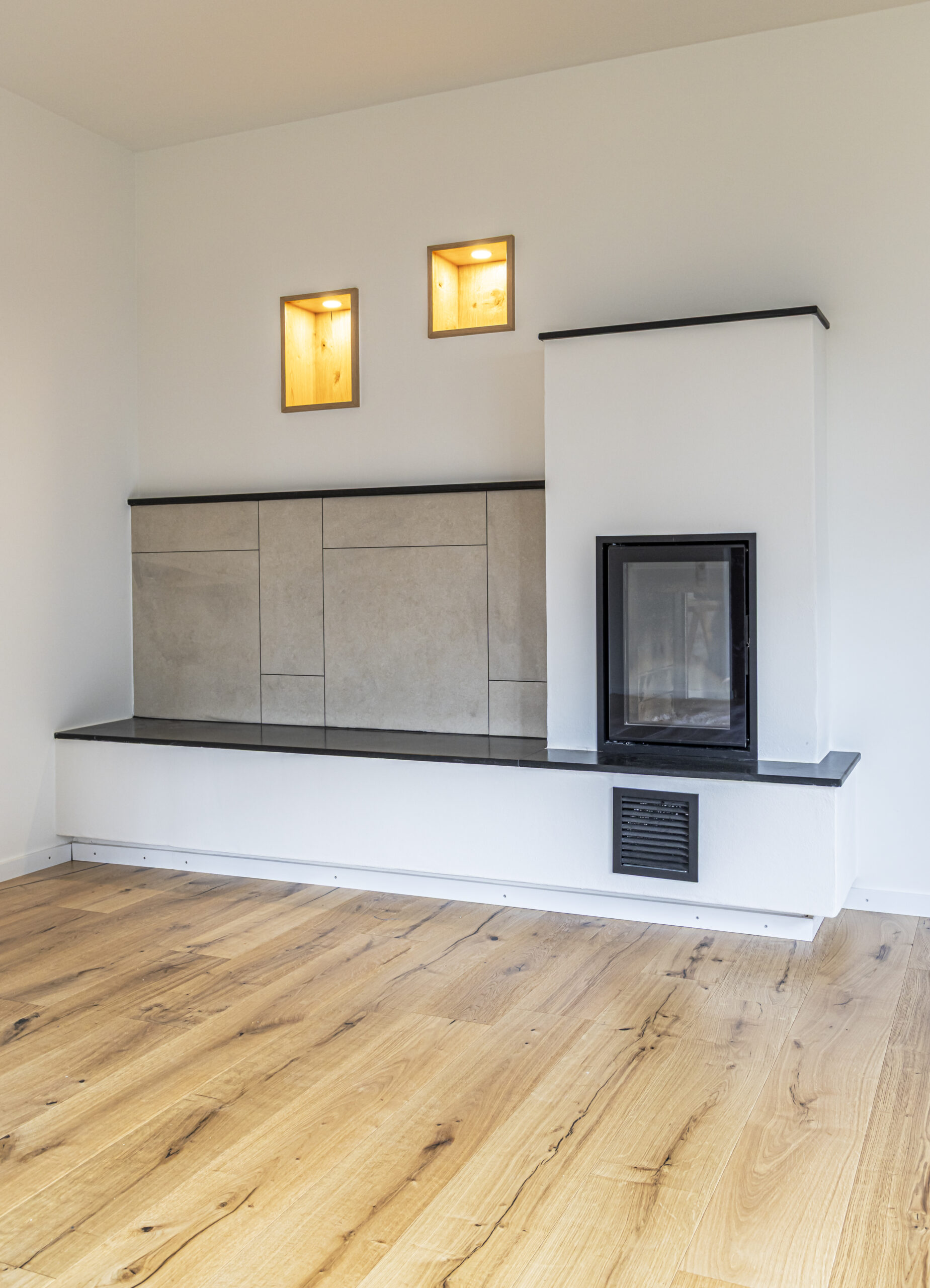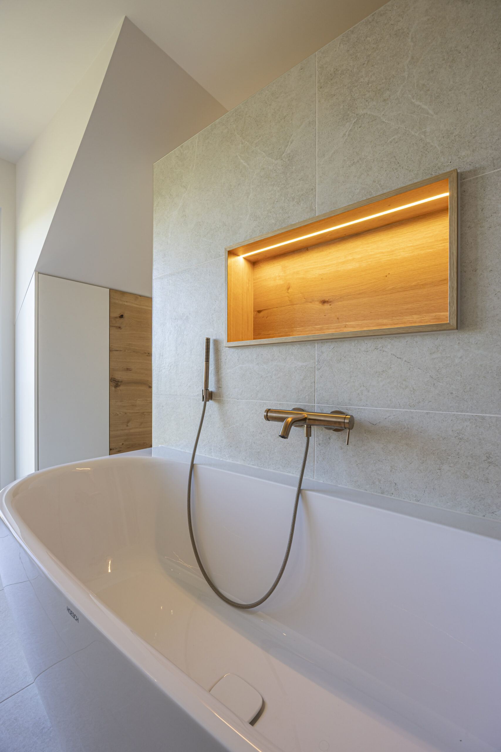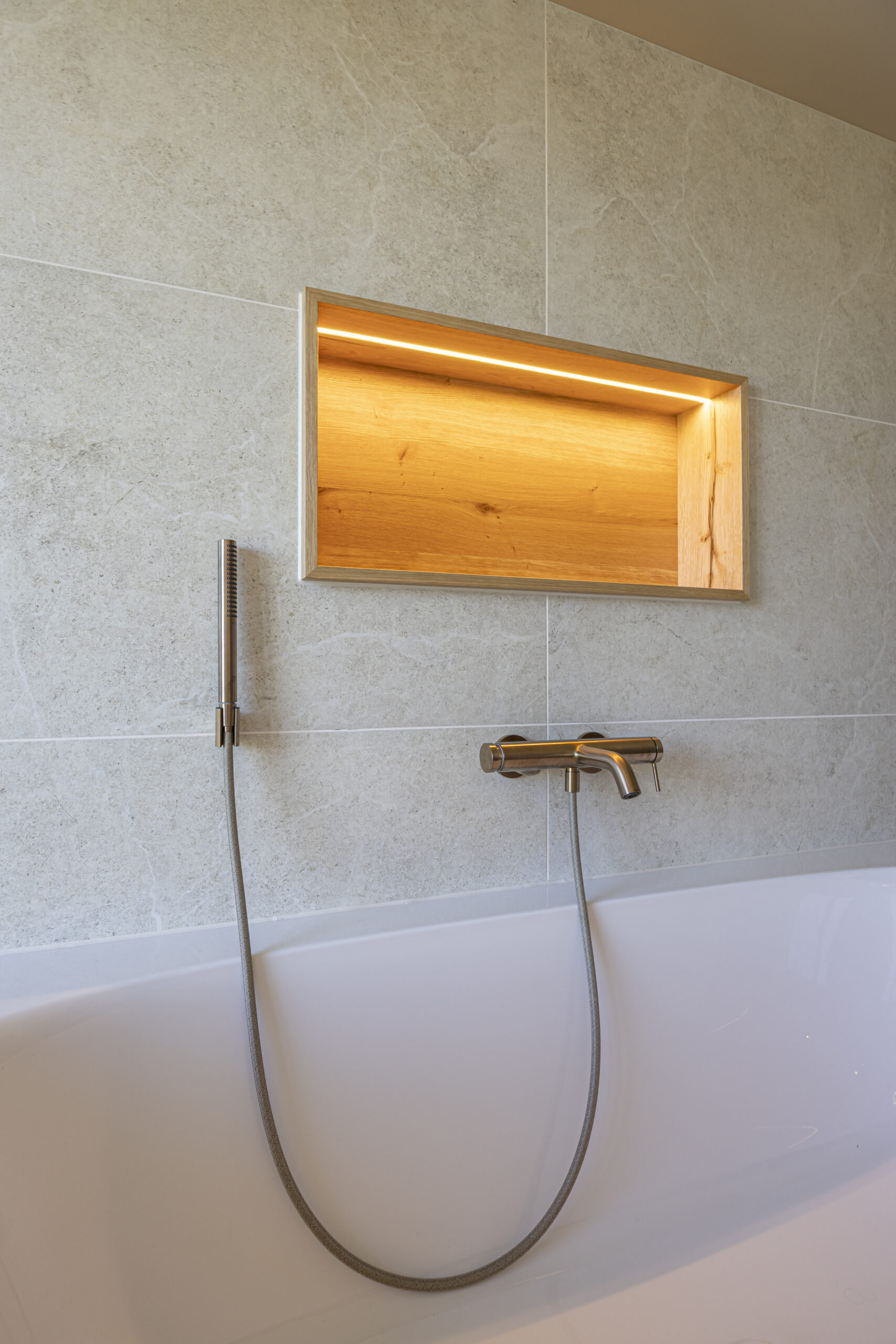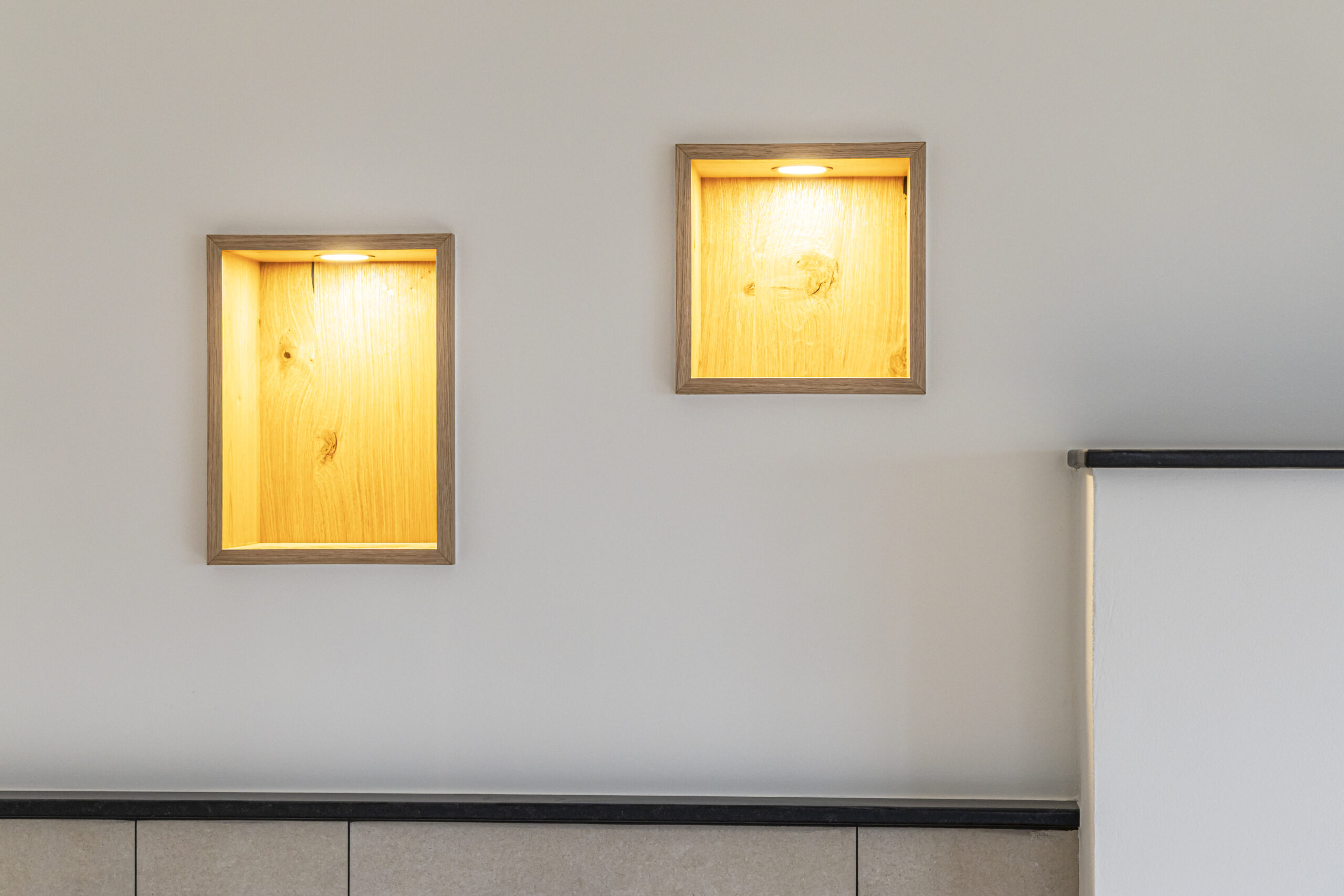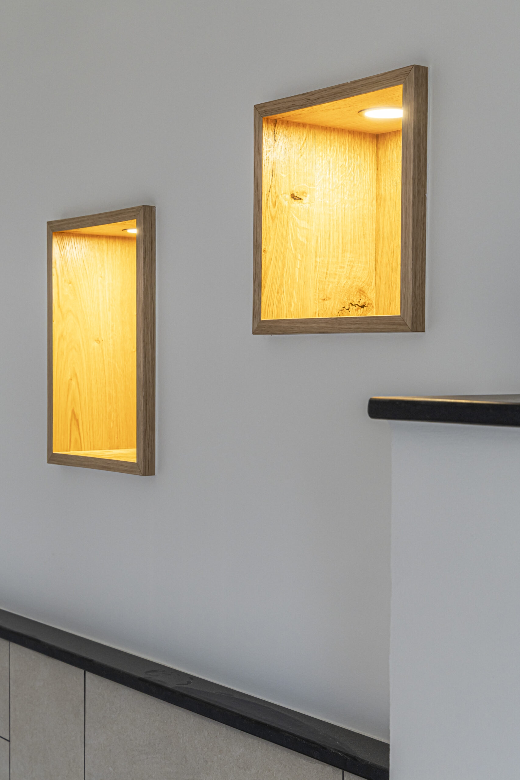 Wie schon in einem der letzten Beiträge gezeigt, machen durchdachte Details den Unterschied – hier in Form von beleuchteten Wandnischen im Wohnzimmer mit warmem Licht und natürlichem Holz.