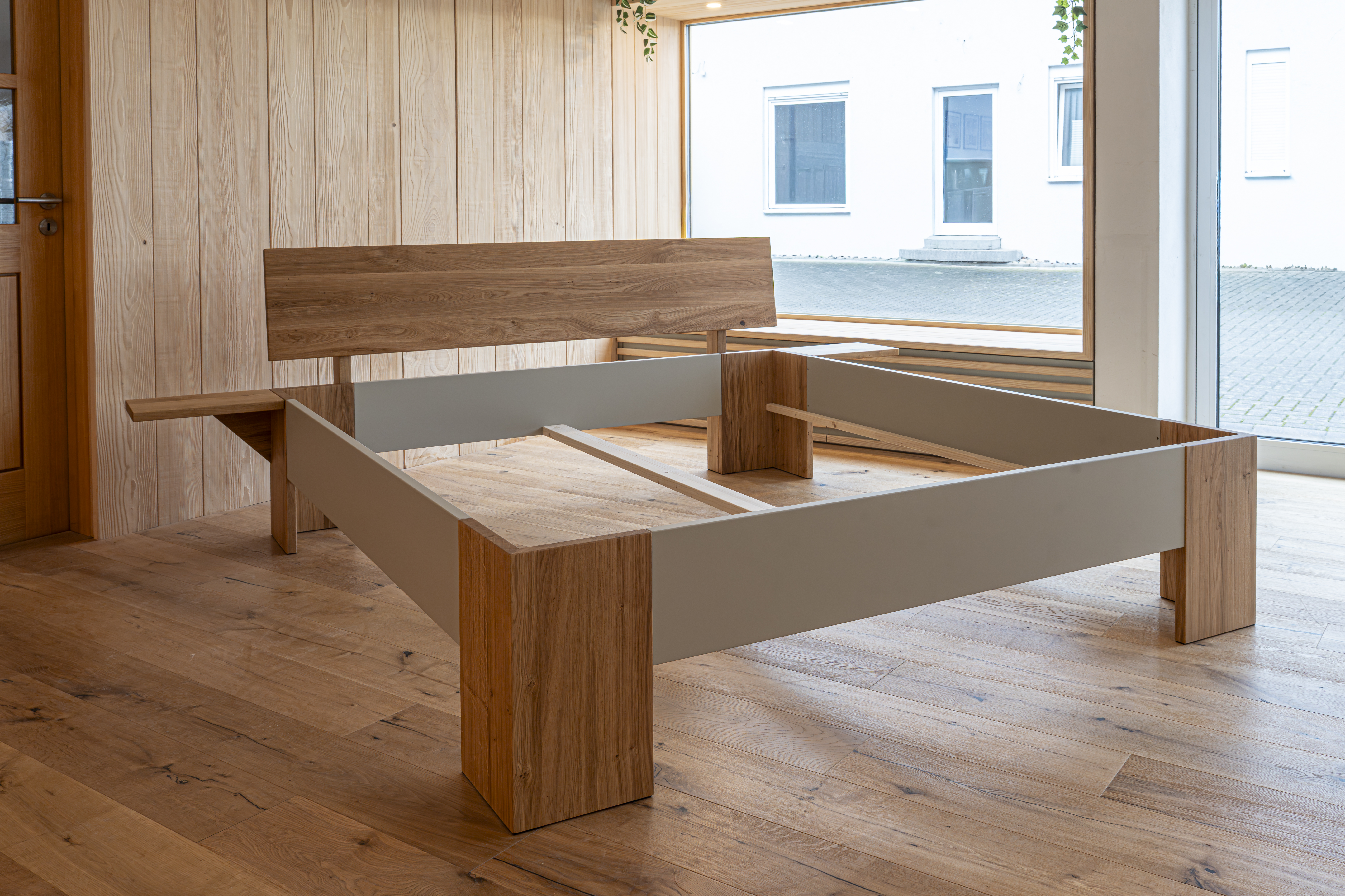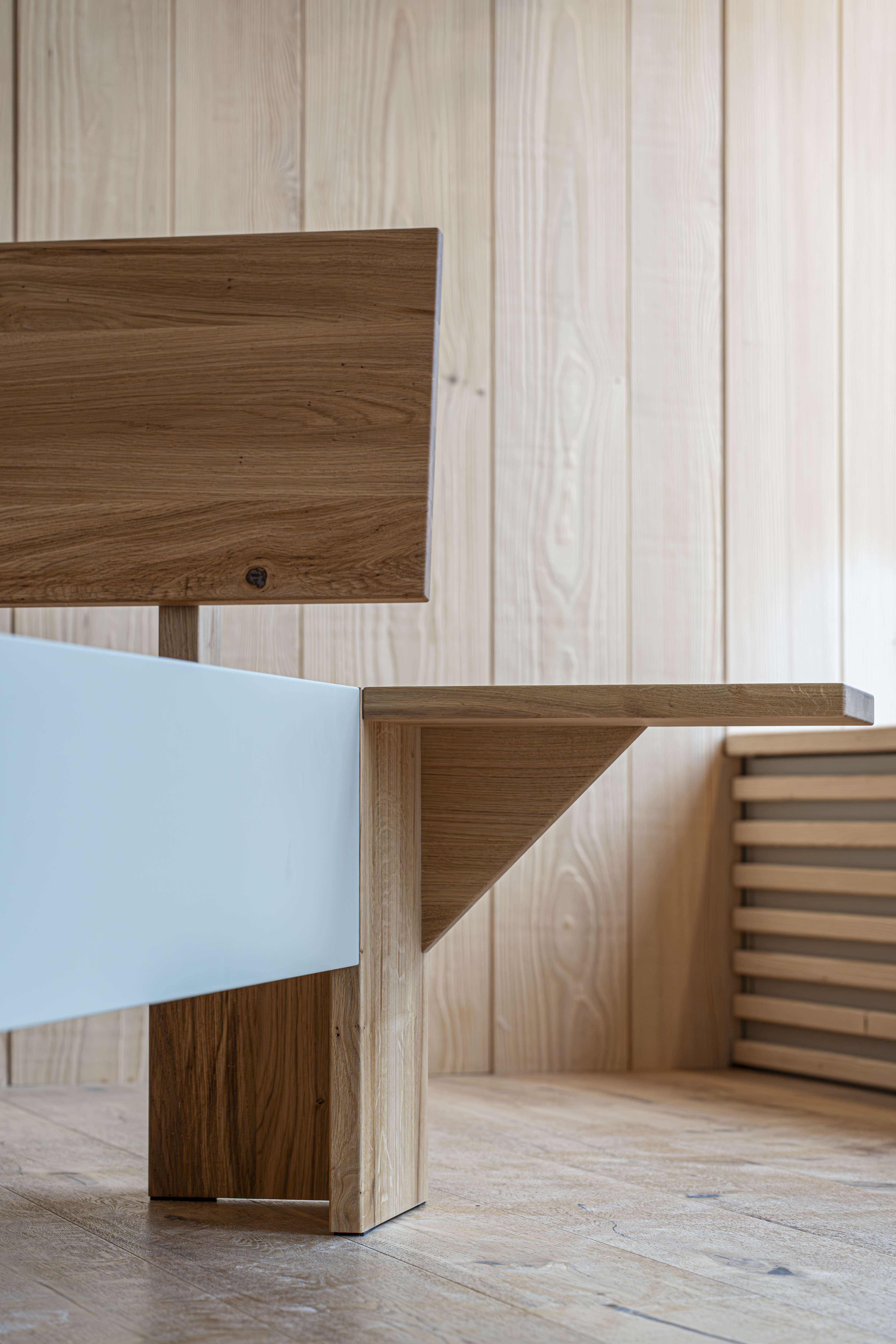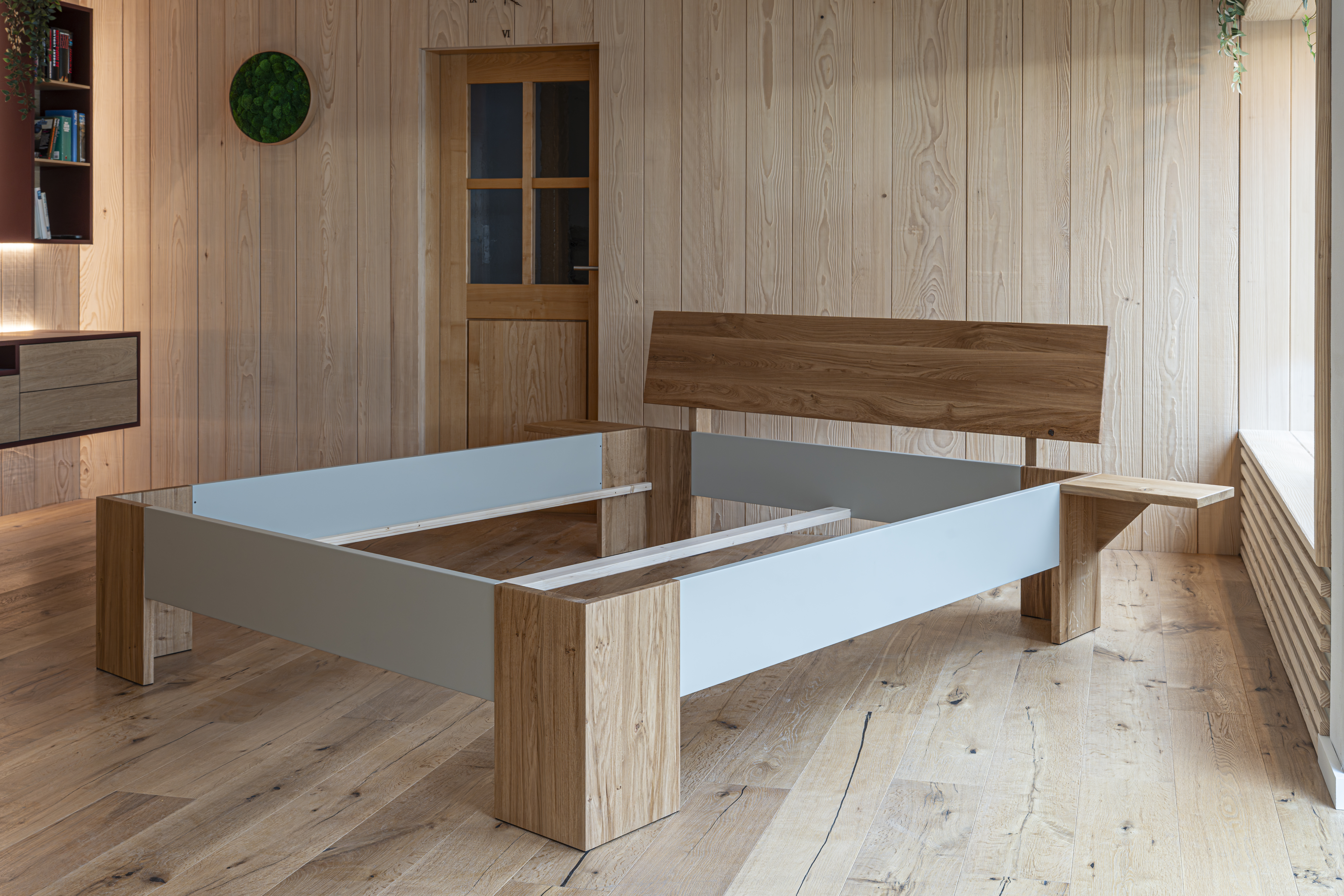Unser Bett aus Wildeiche mit Akzenten in Salbeigrün steht für zeitlose Ruhe und ehrliches Design.
